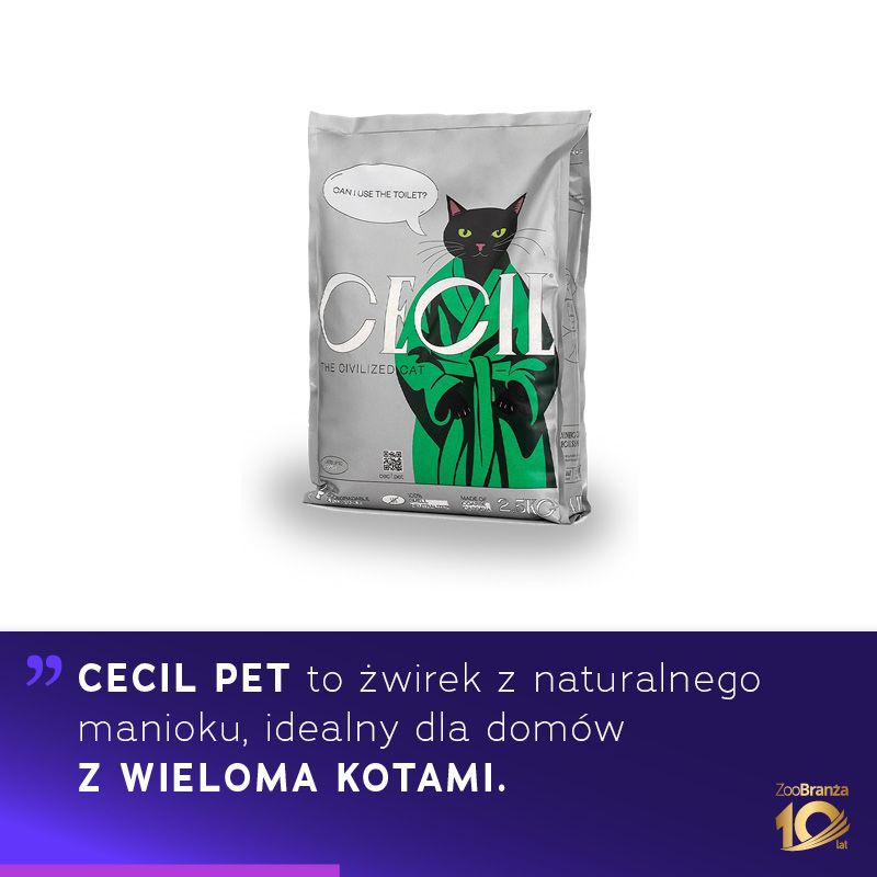Cecil Pet to żwirek z naturalnego manioku, idealny dla domów z wieloma kotami. Skutecznie neutralizuje zapachy, szybko się zbryla i jest bardzo wydajny. Małe, poręczne opakowanie, które łatwo jest przechować. W 100% biodegradowalny – możesz go kompostować lub spłukać w toalecie, w 100% bezpieczny dla kotów.