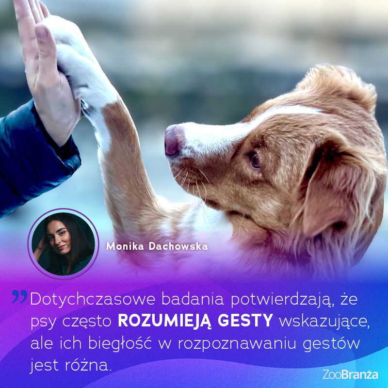 Dotychczasowe badania potwierdzają, że psy często rozumieją gesty wskazujące, ale ich biegłość w rozpoznawaniu gestów jest różna. Prawdopodobnie największe znaczenie mają tu wychowanie i socjalizacja. Mariana Bentosela (Bentosela i in., 2016) przeprowadziła badania nad zdolnością podążania za wzrokiem, czyli umiejętnością obserwowania, w jakim kierunku patrzy człowiek, i reagowania na to. Udowodniono, że psy są w stanie nauczyć się interpretacji ludzkiego spojrzenia już po trzech próbach treningowych. Oznacza to, że umiejętność patrzenia, na co patrzymy, w większym stopniu nie jest wrodzona, a nabyta.
