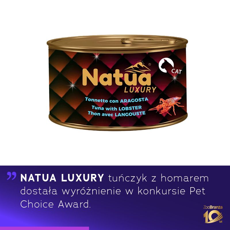 Natua Luxury tuńczyk z homarem dostała wyróżnienie w konkursie Pet Choice Award. Wyróżnienie zostało przyznane przez niezależne grono ekspertów programu Pet Choice Award i potwierdza wysoką jakość, prawidłowy skład i akceptację konsumencką. Pet Choice Award to konkurs dla producentów karm dla psów i kotów. Celem inicjatywy jest wyróżnienie marek, które tworzą receptury oparte na wiedzy naukowej, odpowiadające fizjologicznym potrzebom zwierząt towarzyszących, a jednocześnie stawiają na bezpieczeństwo, transparentność i najwyższą jakość składników. Oceny dokonuje niezależna Komisja złożona z ekspertów rynku paszowego, lekarzy i dietetyków weterynaryjnych, techników, behawiorystów i trenerów, biorąc pod uwagę: skład surowcowy i analityczny, wygląd, sensorykę, funkcjonalność i innowacyjność oraz transparentność etykiety. Wyłącznym dystrybutorem włoskiej marki Natua w Polsce jest AniDis.
