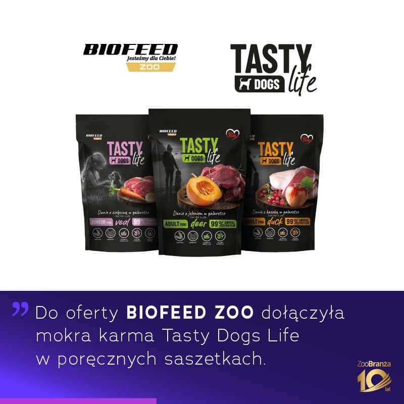 Do oferty BIOFEED ZOO dołączyła mokra karma Tasty Dogs Life w poręcznych, 150-gramowych saszetkach. To idealna porcja dla małych psiaków oraz klientów, którzy preferują wygodne, mniejsze opakowania. Saszetki Tasty Dogs Life to pełnoporcjowe dania w galaretce, stworzone z myślą o zdrowiu, prawidłowym rozwoju i doskonałym samopoczuciu psów.