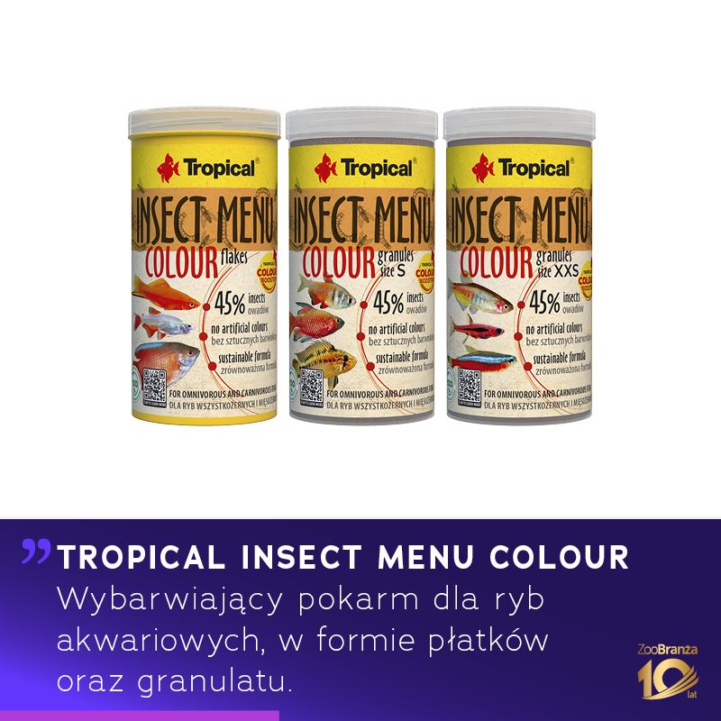 Wybarwiający pokarm dla wszystkożernych i mięsożernych ryb akwariowych na bazie trzech owadów: hermetii (15%), jedwabnika (15%) i mącznika młynarka (15%), z formułą Tropical’s Colour Booster. Pokarm dostępny jest w formie płatków oraz granulatu w rozmiarze S i XXS.