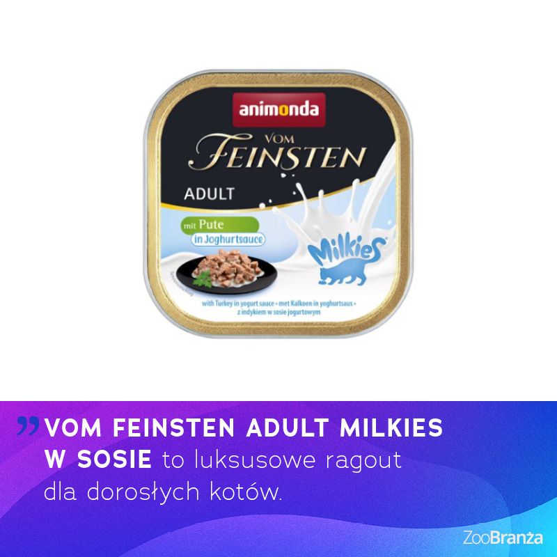 Vom Feinsten Adult Milkies to luksusowe ragu dla dorosłych kotów w sosie, przygotowane z najwyższej jakości mięsa i składników. Produkt dostępny jest w wariantach smakowych inspirowanych kuchnią mleczną, co zwiększa jego atrakcyjność dla kotów o wybrednym podniebieniu.